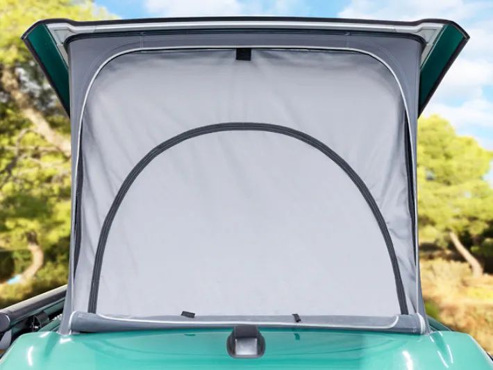 ISO-TOP kann mit einem FLYOUT Moskitonetz nachgerüstet werden. Das FLYOUT wird mittels Reißverschluss in die große Frontöffnung des ISO-TOP eingezogen und oben an den Klettverschluss-Pads der ISO-TOP-Befestigung arretiert. Das Bugteil des ISO-TOP kann heruntergerollt und mit zwei Gummibändern fixiert werden. Im Bugteil befindet sich zusätzlich ein Fenster mit Reißverschluss, das dem serienmäßigen Bugfenster im Faltenbalg des Aufstelldaches entspricht. Befestigung.