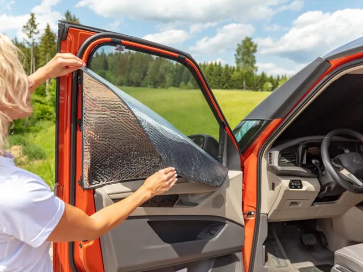 FLYOUT für die Fenster in den Fahrerhaustüren werden mit Spezialklettverschluss rundum dicht angebracht. In Verbindung mit dem FLYOUT für die Heckklappe ist die Durchlüftung des VW T7 sehr gut.