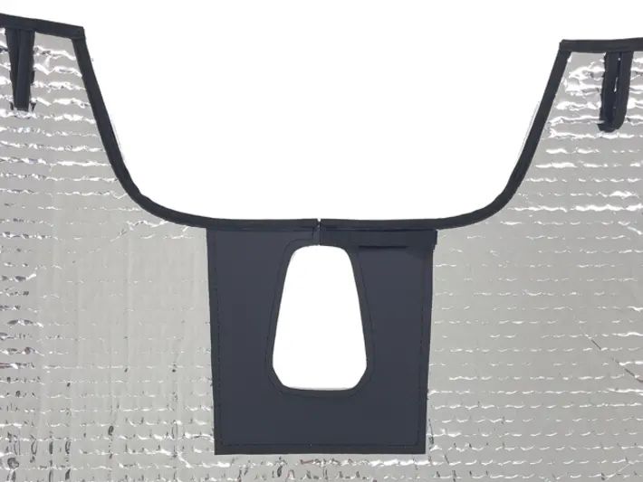 ISOLITE Inside wird einfach in den Windschutzscheibenrahmen eingesetzt und im oberen Bereich der Windschutzscheibe (im oberen schwarzen Streifen des Glases) sowie am Innenspiegel mit Klettverschluss befestigt.