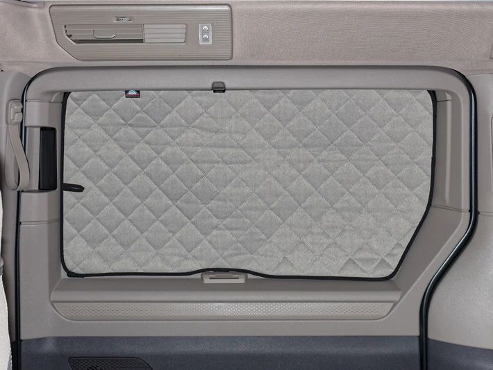 ISOLITE® Extreme für Schiebefenster in Schiebetür rechts, Volkswagen T7 California Ocean/Coast, Beach Camper/Tour ist einteilig und wird mit Klettverschluss befestigt. Das Verdunkelungsrollo lässt sich weiterhin verwenden und über die ISOLITE Extreme® herunterziehen und unten festmachen.