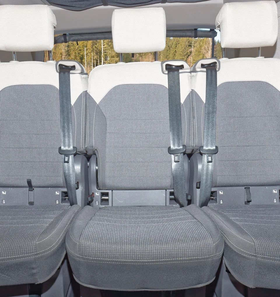 Second Skin® Schonbezüge für den Mittelsitz (2. Sitzreihe) im Fahrgastraum entsprechen dem Volkswagen T7 California Design, sind aus den Volkswagen-Originalstoffen hergestellt. Die Passform ist so gut, dass man Unterschiede zur Serienbespannung kaum sieht.