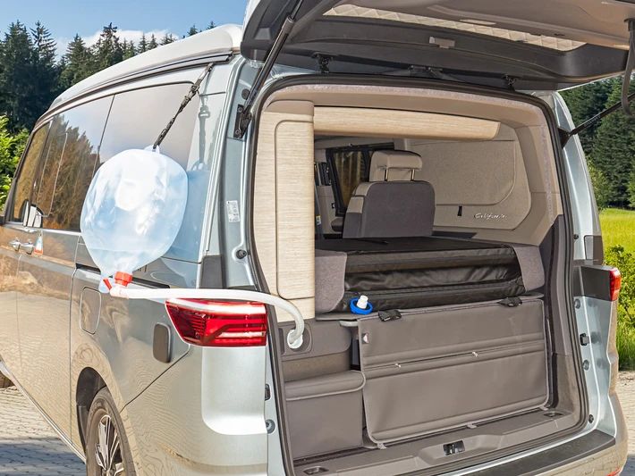 Das Set wurde speziell für die Volkswagen‑T7‑California‑Modelle entwickelt und erlaubt die Nutzung von 10‑l‑ oder 20‑l‑Faltwassertanks sowie einer lebensmittelechten 20‑l‑Solardusche.