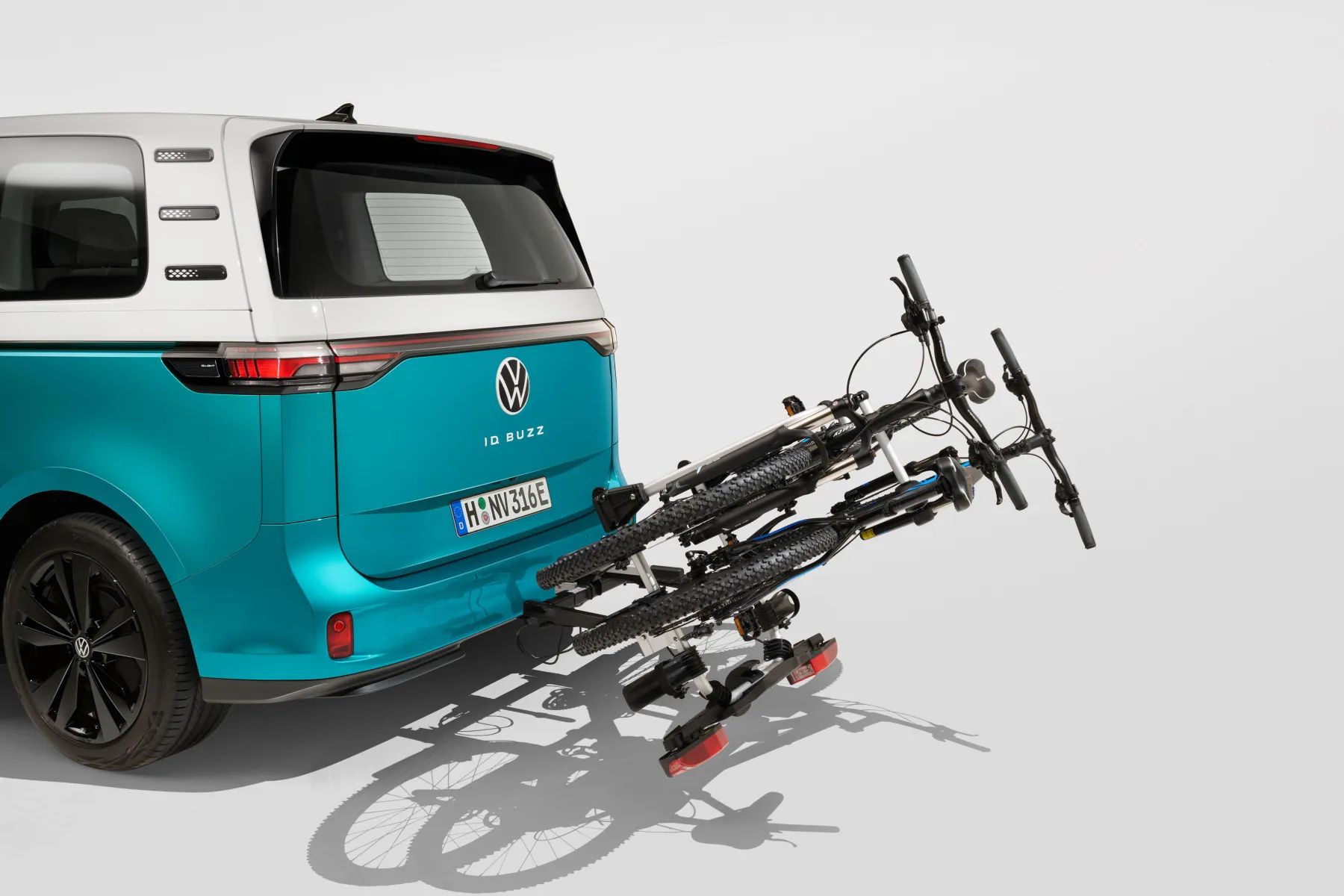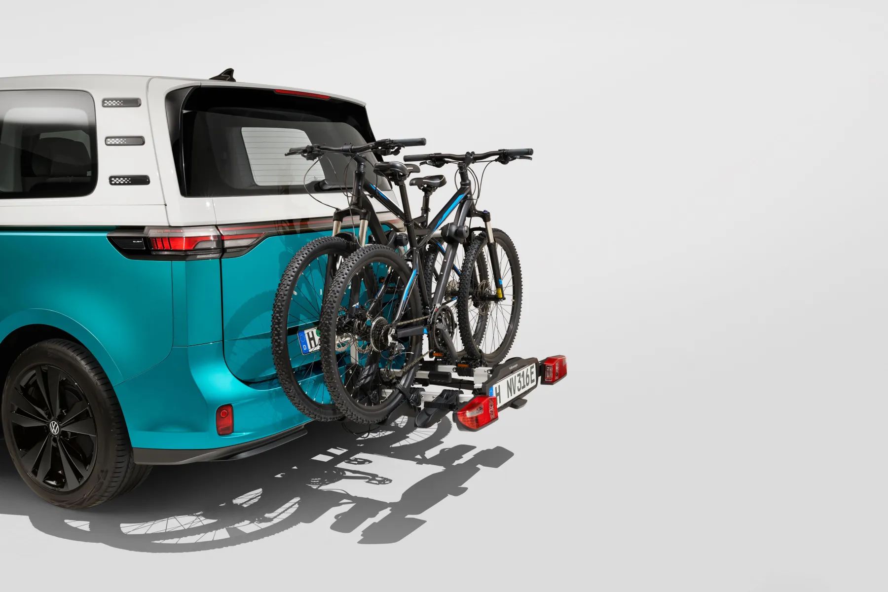 Der Volkswagen Original Fahrradträger "Compact III" für die Anhängevorrichtung ist klein und leicht. Er transportiert bis zu drei Fahrräder. Dank des Klappsystems lassen sich Rückleuchten, Fahrradschienen und Trägerrahmen komplett einklappen und zum Beispiel im Gepäckraum verstauen. Mit dem neu entwickelten Fußschalter gelingt das Abklappen am Fahrzeug – auch mit Fahrrädern – besonders einfach, so dass der Gepäckraum erreichbar bleibt. Beim Hochklappen des Trägers verriegelt er sich automatisch.