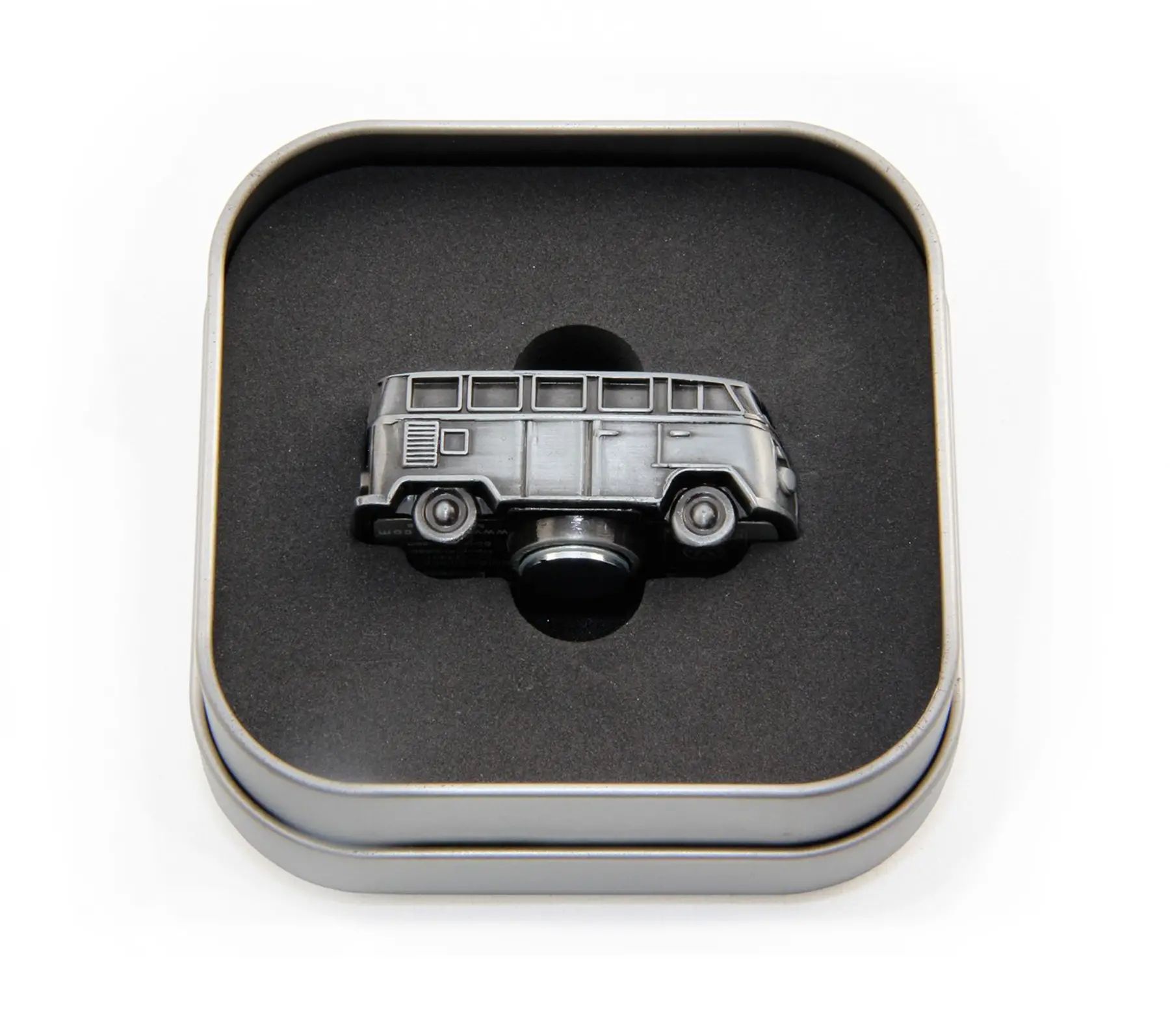 VW Bulli Mini Modell in Antiksilberoptik. Ob als Magnet, einfach nur als Blickfang in der Vitrine oder am Schreibtisch! Besonderes Extra: Jeder Mini Bulli ist verpackt in einer hochwertigen Geschenkdose aus Metall! Maße: 5 x 2,2 x 2,3 cm.